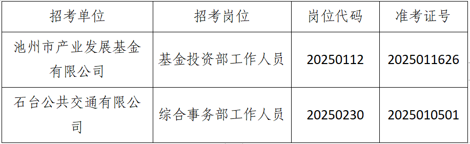根據(jù)《池州市投資控股集團(tuán)2025年公開招聘工作人員公告》要求,由于入圍現(xiàn)場資格復(fù)審的考生中有部分人員自動放棄或不合格產(chǎn)生了人員空缺,現(xiàn)按《公告》要求,在報考同崗位的考生中按筆試成績從高分到低分的順序依次遞補(bǔ),成績出現(xiàn)并列者一并進(jìn)入資格復(fù)審,現(xiàn)將入圍遞補(bǔ)資格復(fù)審情況公告如下: