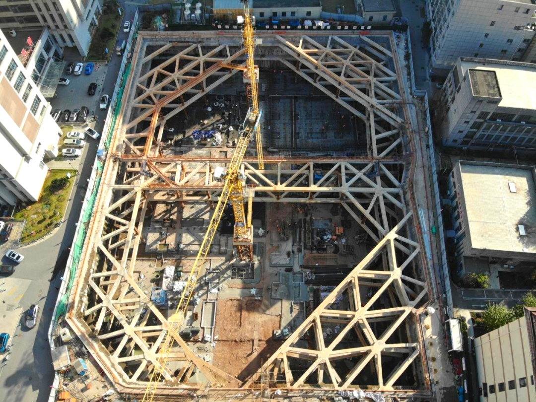 創(chuàng)新采用“旋挖樁+三層混凝土內(nèi)支撐”的復(fù)合支護體系?;悠矫娉叽邕_105.2米×81.9米,深度13.3—15.05米,設(shè)置支護樁279根、鋼立柱54根及三層混凝土內(nèi)支撐。針對雜填土區(qū)域富含地下水的情況,項目在支護樁間增設(shè)214根高壓旋噴樁,構(gòu)筑起一道可靠的截水帷幕,有效防止了基坑邊水土流失,保障了基坑穩(wěn)定與周邊建筑物安全。